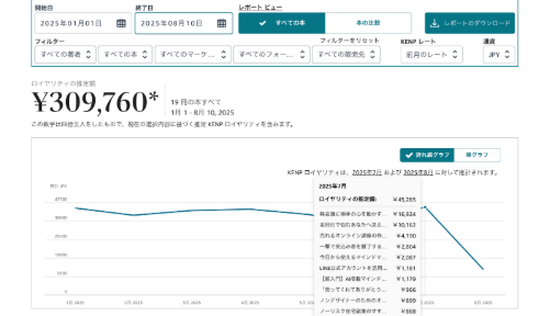 実際に僕は、2025年8月までに20冊のKindle本を出版して、毎月安定して38,000〜47,500円のロイヤリティを得ています。